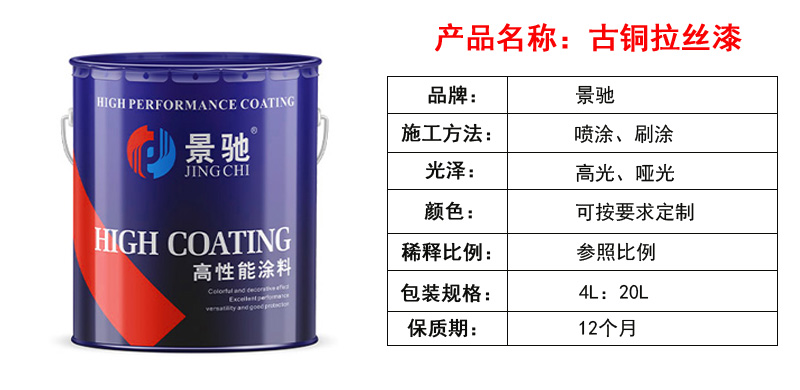 產品介紹:古銅拉絲油漆選取高耐候性丙烯酸樹脂和色粉原料及溶劑調配研磨,添加助劑而成。本品為雙組份油漆,加固化劑稀釋劑即可使用。施工簡易遮蓋力好,并且耐候性非常強,不褪色,不脫落,不起皮,龜裂,戶外持久壽命長。