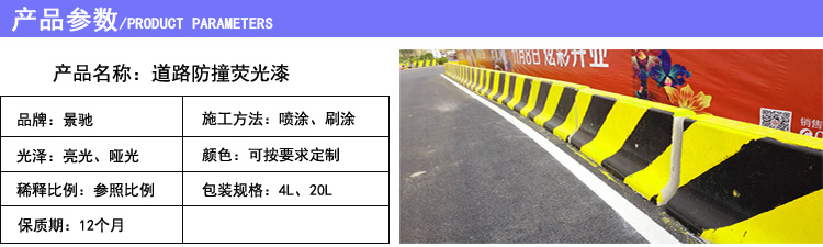 我們景馳高速水泥防撞墩熒光漆就選用這種材料,美觀也可起到很好的警示效果。